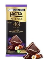 Chocolate Lacta Intense além de possuir um sabor intenso e marcante do chocolate 40% este delicioso chocolate é acentuado por avelã & crocante de cacau com a maciez de Lacta que você já conhece.