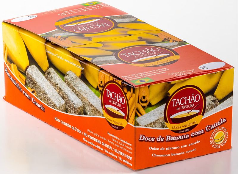 Doce de banana com canela. Display com 25 unidades de 20g cada.As bananinhas são embaladas individualmente em papel metalizado impresso.